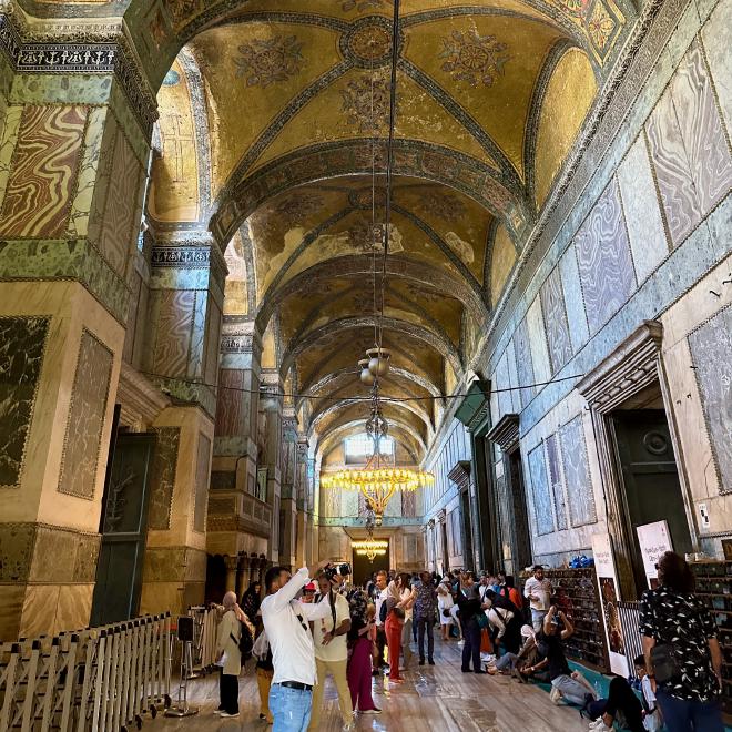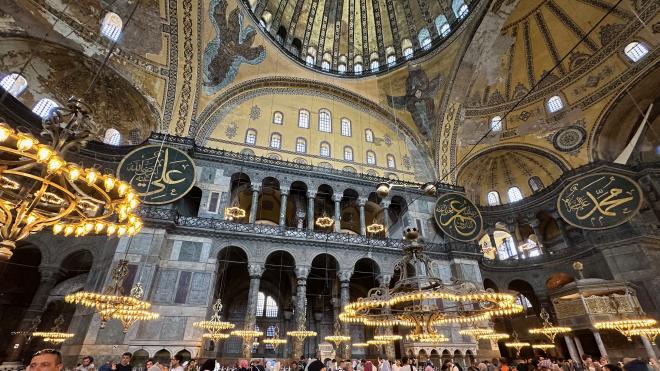 The Hagia Sophia is enormous and roughly square, essentially impossible to show in a single photograph. This wide angle shot was the best we could do to capture a sense of the space. As you can see, some areas of the frescoes are badly in need of restoration; however, given the building’s history, exactly what should be restored is a complex question.