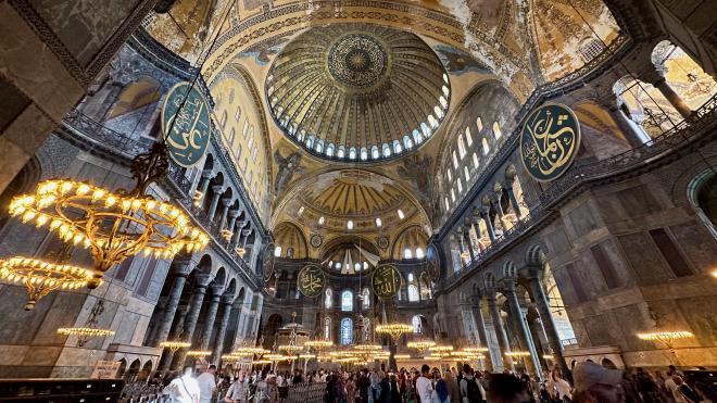 Built as an Orthodox Cathedral between 532 and 537 CE at the order of Emperor Justinian I, the Hagia Sophia has a complex history. It was the third cathedral on the site, its two predecessors having been destroyed by riots in 404 and 523 CE. The cathedral remained Eastern Orthodox until 1204 when it became Catholic following the Fourth Crusade, only to be reclaimed as Orthodox in 1261. When the Ottomans conquered Constantinople in 1453, the building was converted to a mosque, including the addition of minarets. It remained a mosque until 1935, when it was converted to a museum as part of President Atatürk’s secularization of the newly-formed Republic of Turkey. It was reopened as a mosque, after a contentious legal and political process, on 24 July 2020.