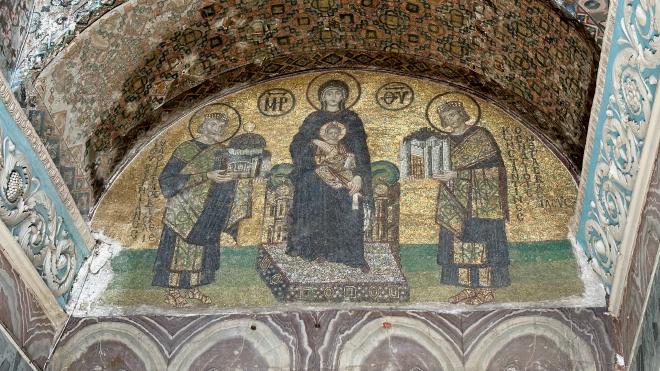 There are still a few visible remnants of the mosque’s time as a Christian church. This tenth-century mosaic, beside the main entrance, shows Emperor Justinian holding a model of the Hagia Sophia and Emperor Constantine holding a model of the city, which they are presenting to the Virgin Mary holding the child Jesus.