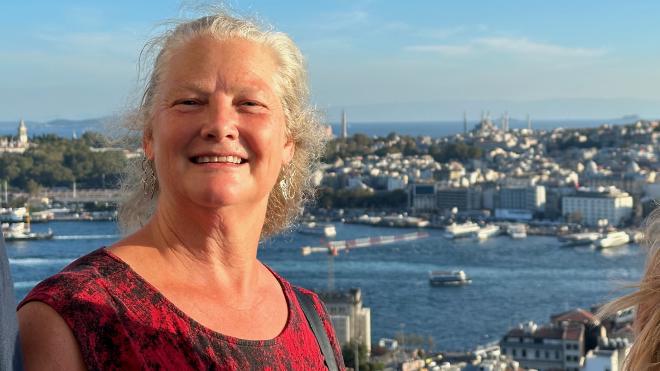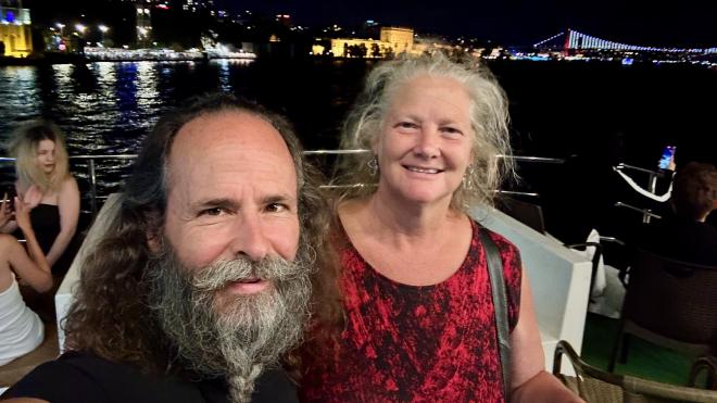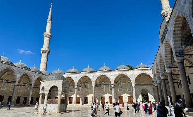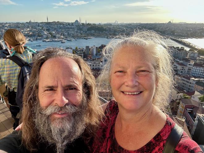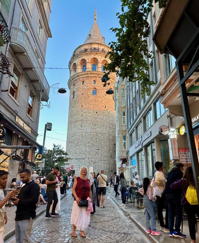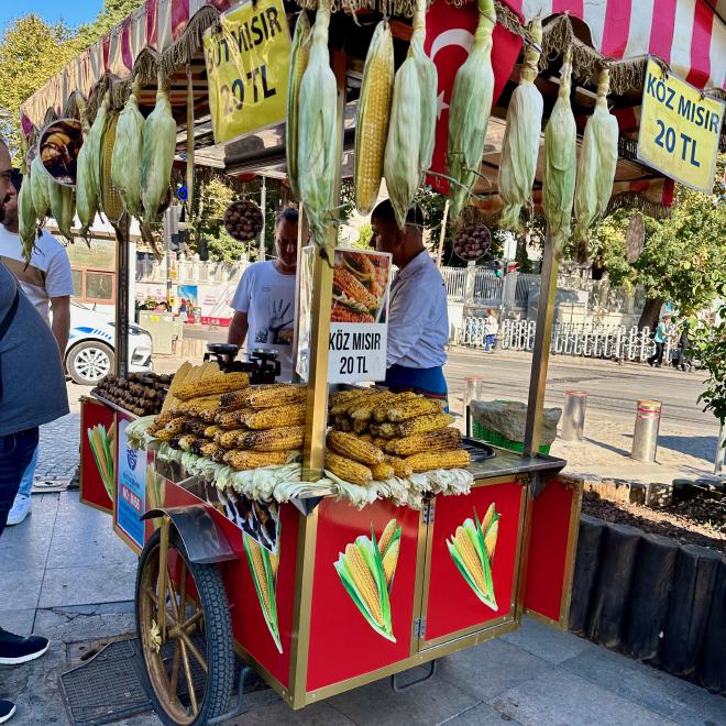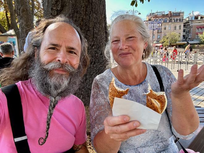 After a visit to the mosques we were feeling a bit peckish, so we paused for some water and snacks. Karen is holding a simit, which is a ubiquitous Turkish street food vaguely similar in texture to a Montreal bagel. We started with one filled with cheese, and followed that with a Nutella-filled simit for desert. The cost was 15 Turkish Lira each, which at the time was equivalent to $1.05 Canadian. But Türkiye has both extreme inflation and a constantly-falling currency, so those prices are already out of date by the time we’re writing this.