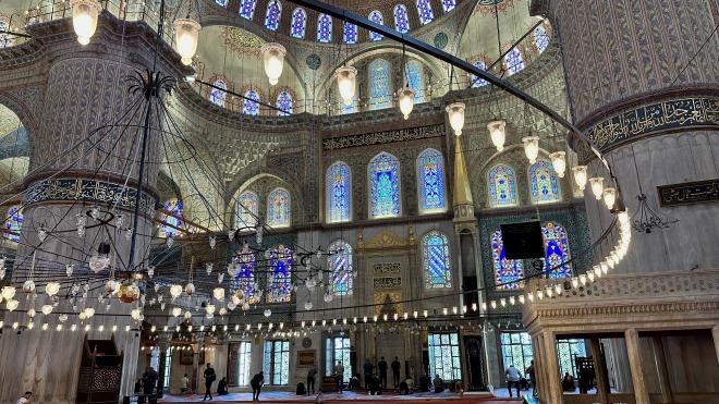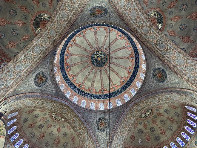 There was no queue to enter the Blue Mosque, so we were quickly inside. The mosque’s interior walls are almost completely covered with tiles, in intricate Islamic patterns. This is the central dome.