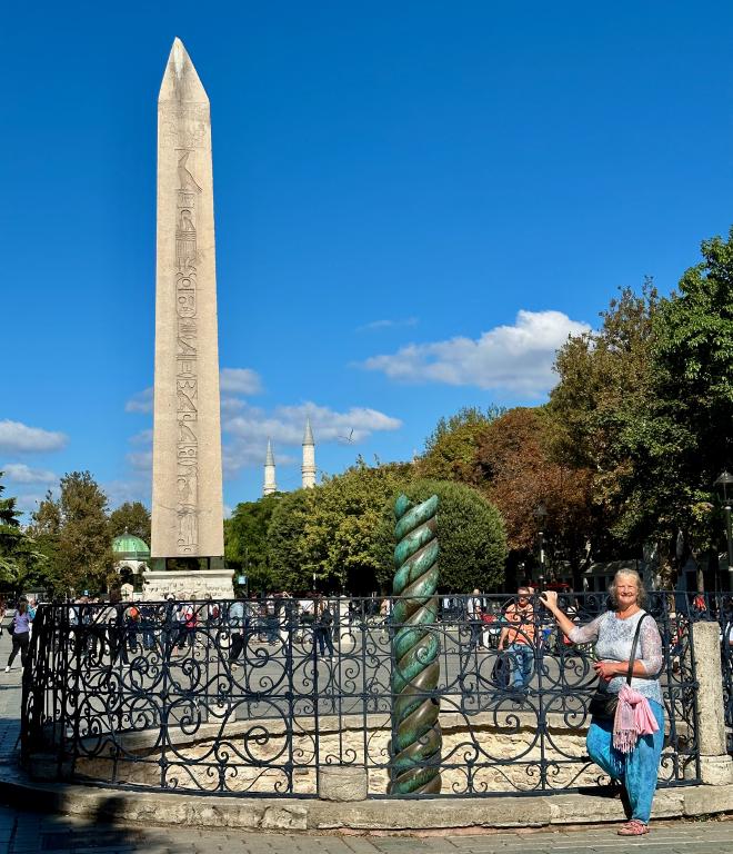 On leaving the Blue Mosque we proceeded to the Hippodrome, once site of a giant stadium for chariot races, now a long plaza. We bumped into the same genial gentleman as before, who unashamedly asked whether we’d enjoyed the mosque, and invited us once again to visit his sister’s carpet shop. We declined. Behind Karen you can see the Serpent Column and the Obelisk of Theodosius.