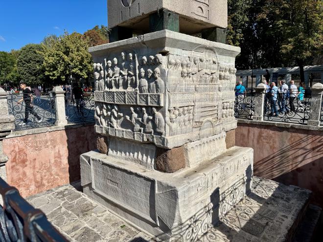 Like the Serpent Column, the Obelisk of Theodosius is Roman plunder. It was originally constructed under Pharaoh Tutmoses III of the 18th Dynasty of Egypt around 1450 BCE in front of the Temple of Amun-Ra at Karnak, only to be removed to Constantinople on orders of Emperor Constantine. Also like the Column it was partially buried for many centuries and its base only excavated in 1857. The obelisk is believed to be missing its bottom third, and currently stands 19.6 metres high. This photo shows its plinth, which dates from the time of Roman Emperor Theodosius I, who had the obelisk erected in the Hippodrome.