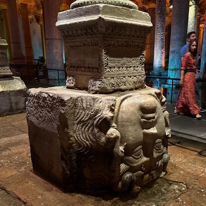 From the mosques we proceeded to the nearby Basilica Cistern. Built on orders of the Eastern Emperor Justinian in the 6th century, the Cistern is just one small part of an extensive urban water system dating back to at least the Emperor Hadrian in 117 CE. Surrounded by salt water on three sides, and having no integral rivers, urban Istanbul has always been reliant on aqueducts and pipelines from the nearby (and distant) forests and hills. The constructed waterways already totalled six hundred kilometres by 380 CE.