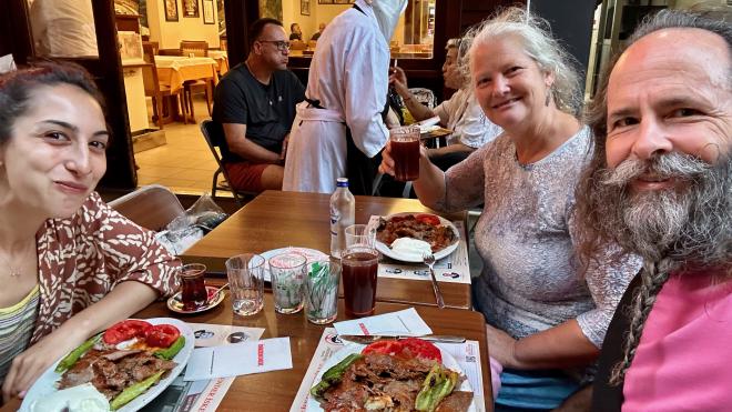 Funda had insisted that we try “real” kebap (kebab) while in Istanbul, so we took her for dinner at the place she recommended as most authentic: the İskender İskenderoğlu restaurant near the Kadıköy ferry terminal. On hearing the word “kebab”, most North Americans probably think of shish kebap, which is marinated cubes of meat and vegetables grilled on skewers. It turns out there are at least 18 distinctly different kinds of kepap just in Türkiye, and many more worldwide. For Funda, “real” kepap is İskender Kebap, which was invented in the city of Bursa by the founder of İskender İskenderoğlu and is the only dish this restaurant serves. You have one choice to make: large, medium, or small. We had medium; Funda, being wiser, had small. The dish consists of beef grilled on a vertical skewer, thinly sliced and coated with a tomato sauce, served over crisp chunks of toasted pita, with melted butter poured over at the table. It’s accompanied by grilled peppers, grilled tomatoes, and yogurt. As Funda had promised, it was delicious. The original İskender İskenderoğlu restaurant was opened 1867 – so it’s as old as Canada. It’s been run by the same family for six generations and is now a chain with eleven restaurants around Türkiye.
