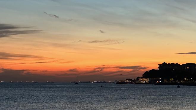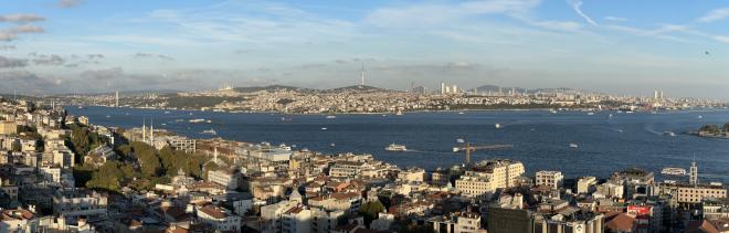 This panoramic shot eastwards shows mostly the Bosporous, with Asia on the far side and just the edge of the Golden Horn at right.