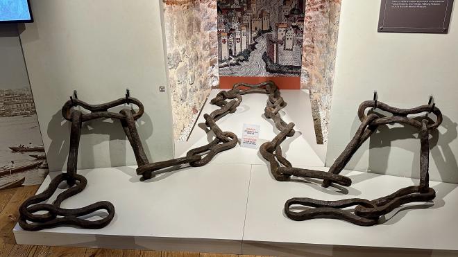 There is an elevator up to the sixth floor of the tower, with those seeking a view being required to walk up two further floors. Visitors are encouraged to walk down and visit the lower five floors, which contain a museum presenting displays from and artifacts about the tower and the history of the surrounding area. This is a section of chain dating from the Byzantine period. In times of danger, the chain would be suspended across the mouth of the Golden Horn to prevent enemy ships from entering. When the Ottomans invaded in 1453, the chain forced Sultan Mehmet the Conqueror to drive his warships over land into the Golden Horn – but he took the city regardless.