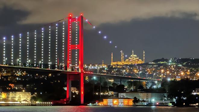 The 15 Temmuz Sehitler Bridge (15 July Martyr’s Bridge, also known as the Bosporus Bridge or the First Bridge) with the Çamlıca Mosque on the eastern bank.
