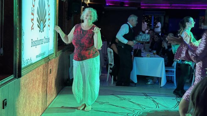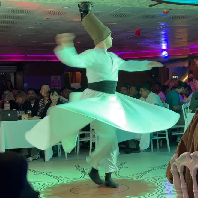 The floor show included a company of six dancers plus a bellydancer. This is a very non-traditional rendition of the Whirling Dervish, which is actually a Sufi meditative practice and not at all appropriate for a cabaret show. But hey, give the crowd what they want!