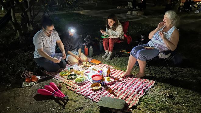 We ate dinner by headlamp and phone flashlight under the trees beside a skate park. Many cats wandered by looking for a handout; Funda came prepared and set out a bowl of kibble a distance from our picnic blanket. After dinner, Funda and Greg did some club passing under a light by the pathway.