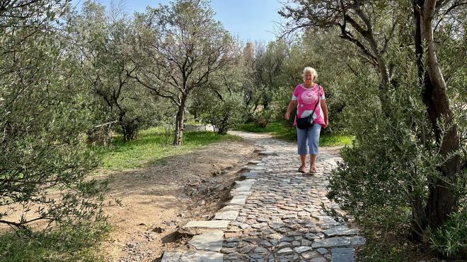 The path down the Hill of the Muses towards the Pnyx Hill is partly built on the route of an ancient fortification wall. It was nicely lined by olive trees, whose shade was welcome in the heat.