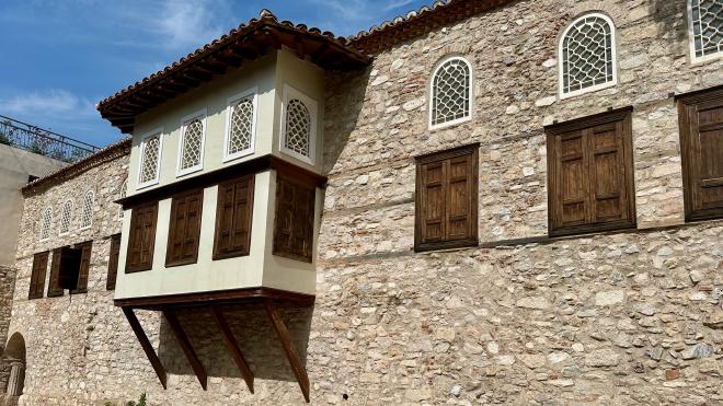From the churches we went to the Benizelos Mansion, also known as The Oldest House in Athens. This is the oldest remaining example of the konaki or “urban mansion” style of home, common in the Ottoman Empire from the middle of the 17th century. This is the front courtyard. The lower level is mostly storage and utility spaces; the main living quarters are on the upper level.