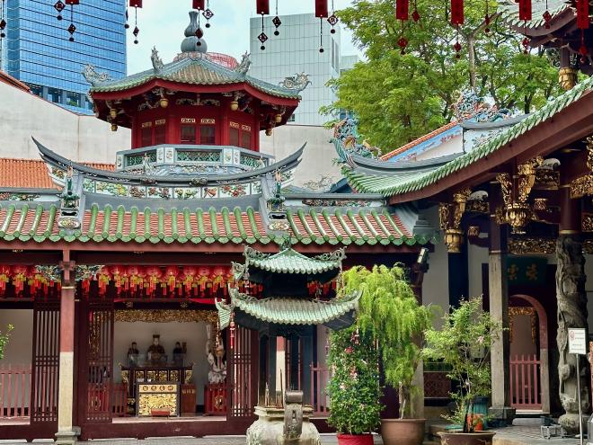 From there we went to the Thian Hock Keng Buddhist Temple. This was built to worship Mazu, the Chinese sea goddess, and was right on the shoreline when it was completed in 1842. These days it’s well inland – much of Singapore is on land reclaimed from the sea.