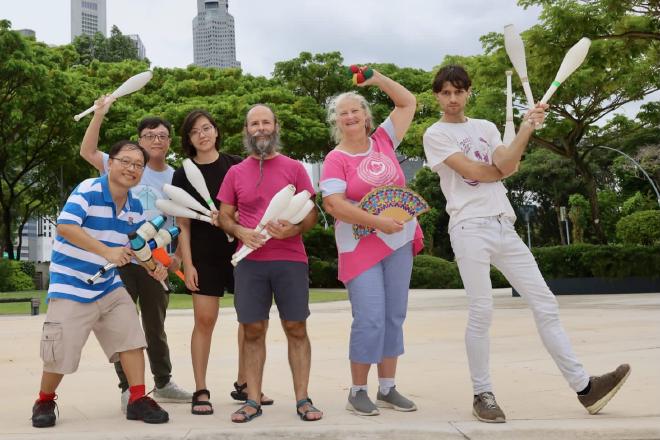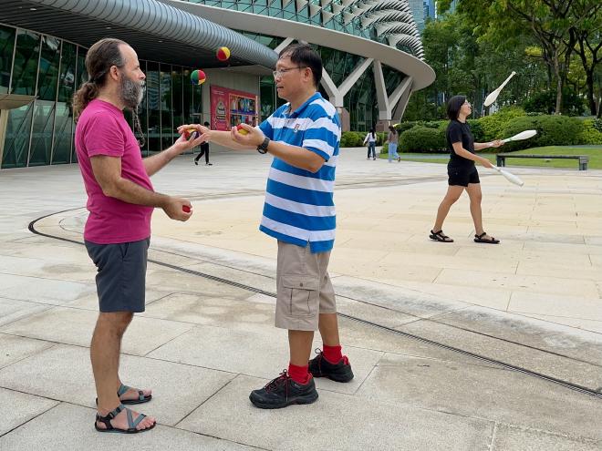 Then in July at CoastlessCon we met two more jugglers from Singapore, Di Hong and Xin Fang (aka Chia). We mentioned our planned visit and that we would be hanging out with Koah Fong – who is one of the original Singapore jugglers and well known in the community – and they offered to join us as well.