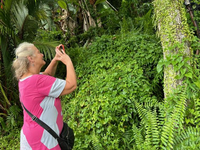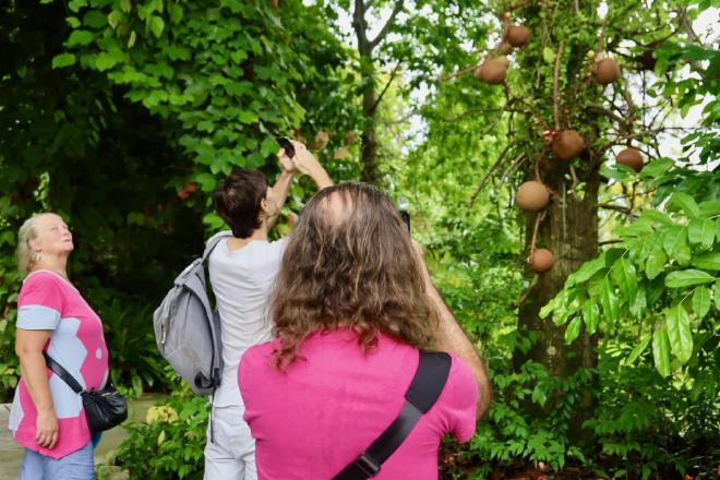 And here’s a picture of Karen watching Greg take a picture of Cyril taking a picture of a plant. This is the aptly-named cannonball tree. (LKF)