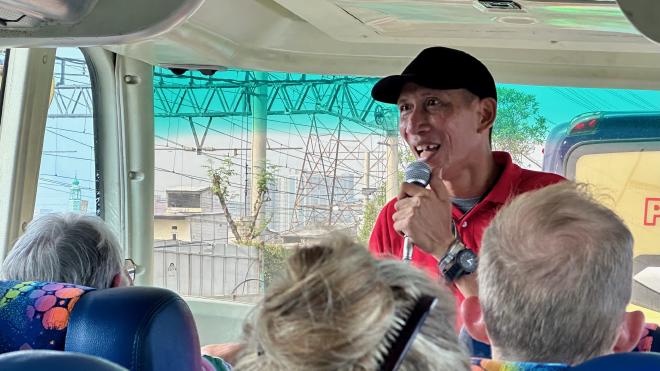 Our tour guide, Aire Saksono, had a terrific sense of humour and was cracking jokes almost continuously. He did a great job of making our time stuck in traffic more bearable. And we were better off than most traffic, as our tour bus convoy had a police escort directing traffic around us. (Which likely made things even worse for the other drivers. Conflicted? Us? Yes.)