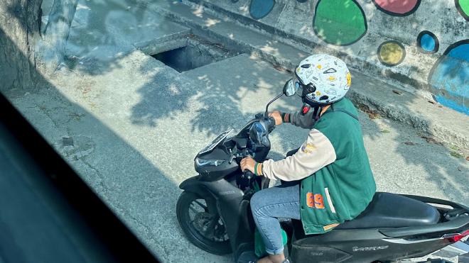 If you want to get around Jakarta kind-of quickly, motorcycle is your best option. You see them everywhere, splitting lanes and, as here, riding on the sidewalks. Motorcycle taxis are a big thing in the city, recognizable by the green helmets their drivers wear. But the sidewalks are nothing like safe – most of the stretch from the port into the city centre had huge, open holes, like this one.