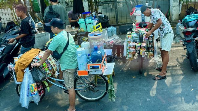 En route to our next stop Greg managed to snag this photo of the ubiquitous bicycle vendors, here selling water, coffee, and snacks at a motorcycle taxi stop.