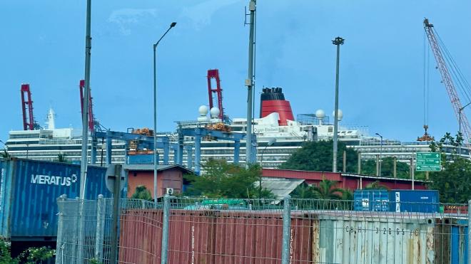 From Kota Tua it was back to the Queen Elizabeth. Here you can see her poking up above the cargo-handling equipment in the industrial port.