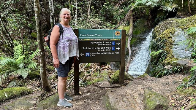 The Round walking track goes part-way down to the valley floor, then back up again. Here is Karen on the climb back up, with Witches Leap falls in the background.