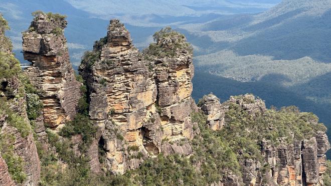 If you look really closely at this photo you can see a building near the centre on the cliff top, a suspended cable car just to its right, and the bottom end of a funicular railway at the lower left. These are part of Scenic World, which has offered “the world’s steepest passenger train” since 1945. We decided to give it a miss.
