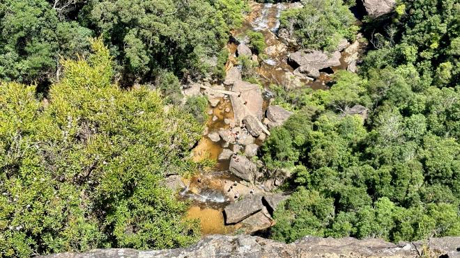 Just past the falls there’s a view directly down the cliffside to the bottom of the first cascade. See the people there? That was our destination.