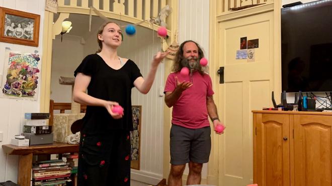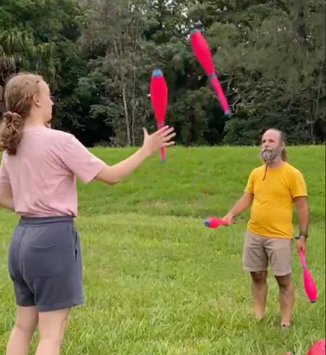 That afternoon we visited Rob’s place so that Greg and Nicki could have their promised club passing session. Nicki’s circus school emphasizes other circus arts over juggling (boo!) and doesn’t have clubs (double boo!), so Nic hasn’t done much passing – but it didn’t take Nic and Greg long to get solid runs of five club one count running. Apologies for the low-quality picture – it’s actually a screen-grab from a video Chez sent on the family WhatsApp group. Photo by (CT).
