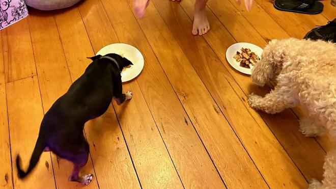 The 1st of February is the birthday of Rob’s dog Twilight. As a special birthday treat, Twilight (the black one) got to have her favourite food – pizza. Marg’s dog, Maisy, was also offered pizza but had exactly zero interest. Twilight took care of Maisy’s share later.