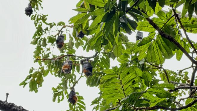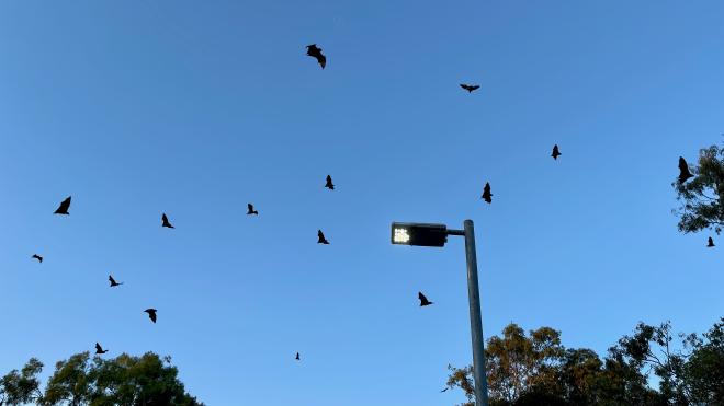 There are hundreds, possibly thousands of Grey-headed flying foxes living in the trees along that stretch of the creek. Australia’s largest bat, with a wing span up to one metre, they’re quite striking when they all head out in search of food. But don’t worry: the flying fox is a fruit-eating bat, and has no interest in people.