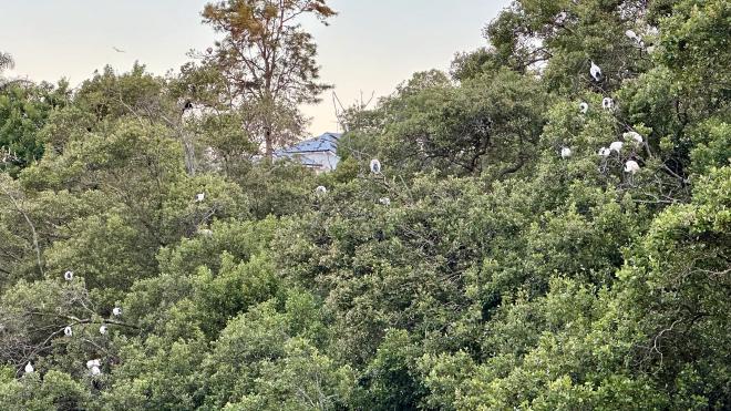 Interestingly, the Australian white ibis, also known as the “bin chicken” for its habit of scavenging in the garbage, is quite happy to share roosting space with the flying fox.