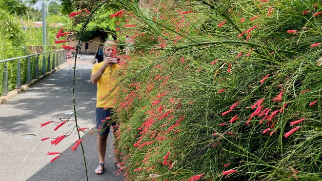The parkland is on the site of a former railway yard, and has been beautifully repurposed as a garden, children’s play area, picnic ground, and event space. Here’s the usual picture of Karen taking a picture of a plant.
