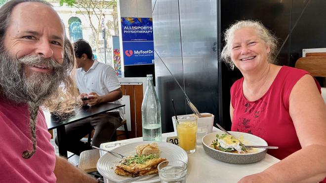 February 6th was our 36th wedding anniversary, and we decided to celebrate with brunch out and a visit to the Brisbane city centre. To the best of our recollection, this is our first outdoor anniversary brunch ever, the weather being slightly less cooperative in February in Canada.