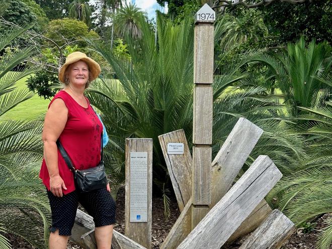 The Brisbane city centre is on a bend of the Brisbane River, and near the tip of the bend is the City Botanic Gardens. This marker in the Gardens records the heights of the 1974 flood and the 2011 flood. Flooding remains a significant planning problem for the city.