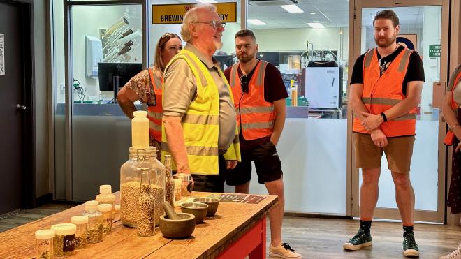 Our guide, who was a serious character, has been an employee of the brewery in various capacities for almost five decades. Here he is explaining the brewing processes of the various beers brewed by Castlemaine Perkins. Through the window you can see the analysis laboratory where quality control measures of the brews and their ingredients are made.