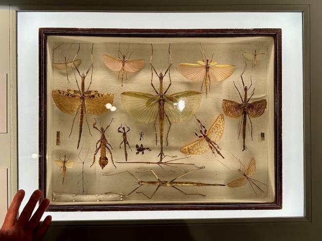 One of the more interesting parts of the Museum was the Dodd Collection, which shows a rotating selection of the insects captured in Queensland and New Guineau by by F.P. and A.P. Dodd from about 1900 through 1960. This photo shows one of the 27 cases that make up the collection, this one of stick insects, with Karen’s hand for scale.