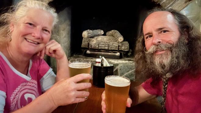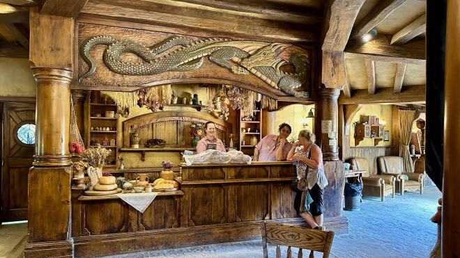 As some of you may know, Karen’s nickname in high school was Rosie, from her last name, Swensson-Rosenquist. And Rosie is also the nickname of the hobbit Rose Cotton, the Green Dragon barmaid that Samwise Gamgee ultimately marries. So, we couldn’t pass up the opportunity to get a good shot of our Rosie enjoying a half-pint by the bar. This Green Dragon has its own range of signature beer, with a non-alcoholic ginger beer for those who don’t imbibe. Greg had the amber and Karen had the stout, both of which were excellent.