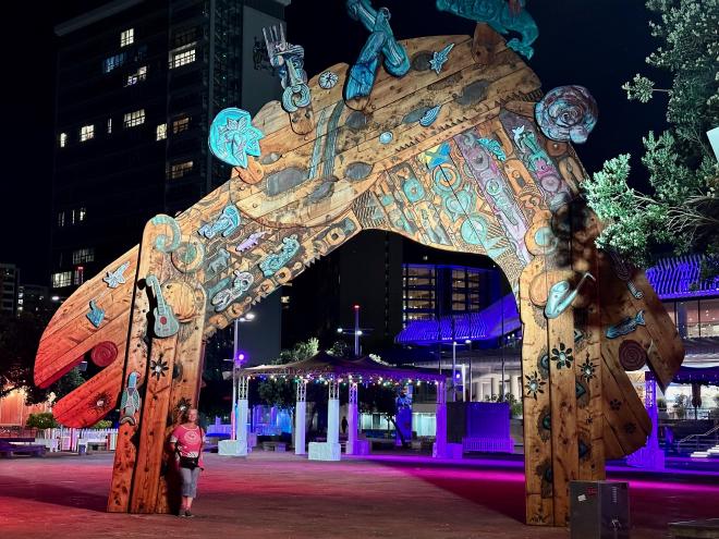 The apartment was just off Aotea Square, which is fronted by the Waharoa gate. The apartment building, which is at the left of this photo, is a former city government office tower converted to condos.