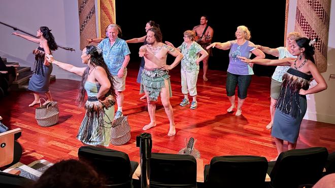 The presentation included stories, songs, history, and dance, with a focus on post-colonial reclamation of Māori culture. At one point audience members were invited to join the dance, and of course Karen was the first to go up. The two lead presenters were a husband and wife team: the woman at the front and the man just behind her.