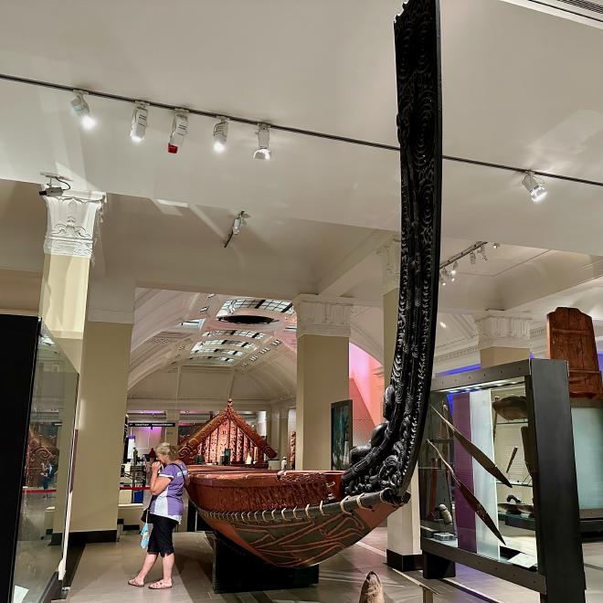 The large canoe, or waka, is Te Toki ā Tāpiri, the last great war canoe that was used in battle. It was carved around 1836 from a single tōtara log, is 25 metres long, and could seat over one hundred warriors.