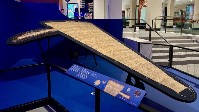 This is Te Rā, woven from harakeke (also known as flax, but unrelated to the European plant of the same name) sometime between 1770 and 1800. It is the last surviving example of the traditional Māori sail, as the Māori adopted European sail patterns shortly after contact.