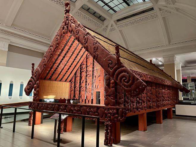 This is a highly-decorated wharenui, or meeting house. It is one of several Māori buildings in the museum.