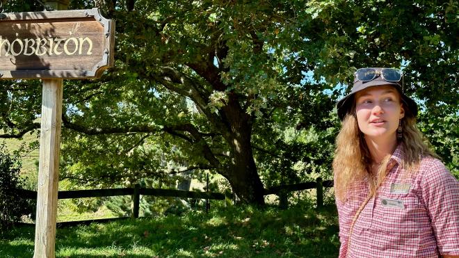 This was our guide, One (oh-neh), a young Norwegian woman in New Zealand on a work visa. She was a wonderful story teller, had a terrific sense of humour, and was a master at managing our group. She asked how many people had seen the films or read The Hobbit, The Lord of the Rings or The Silmarillion. Amazingly, there were people on the tour who hadn’t seen or read any of them – and Karen was the only one to have read The Silmarillion.