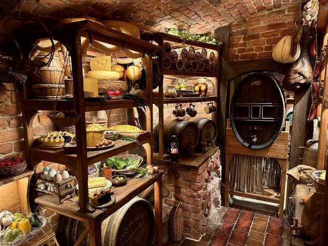 Of course the interior holes include the most important room in any hobbit home: the pantry. Everything you see here is a beautifully-detailed fake, and permanently fastened down, for obvious reasons.