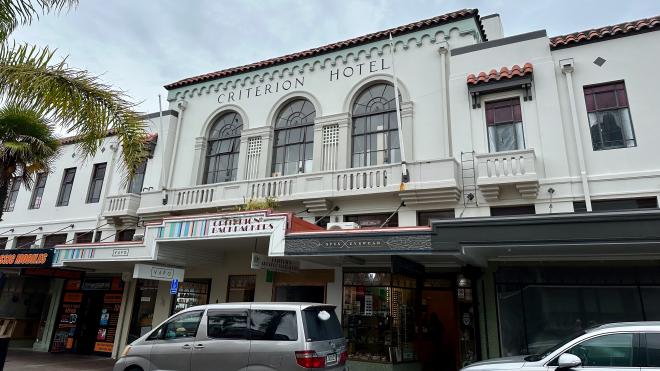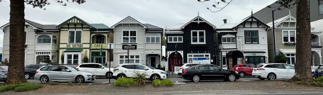 These houses are the Six Sisters. The (possibly apocryphal) story goes that in the 1890s the early 1900s, the manager of the Napier Port had six daughters, so he had a row of six houses facing the water built for them and their families. Three have been converted to businesses but the other three are still private residences.