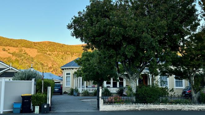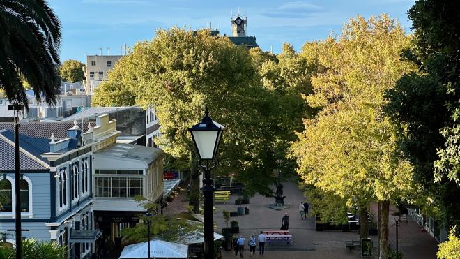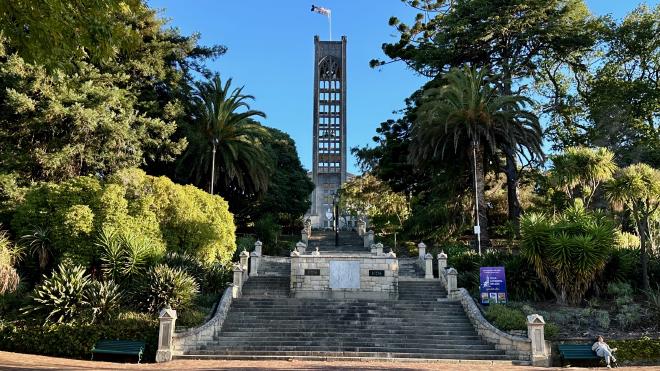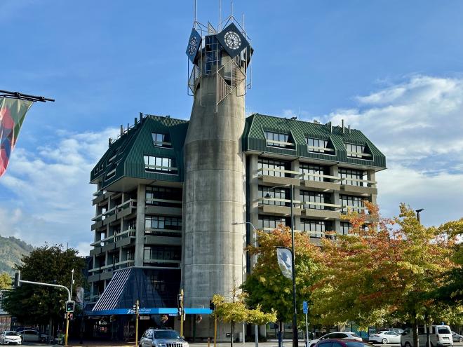 The top of the Cathedral steps offers a view of Nelson’s core, with the city’s other clock tower, at the City Council building, visible in the distance.