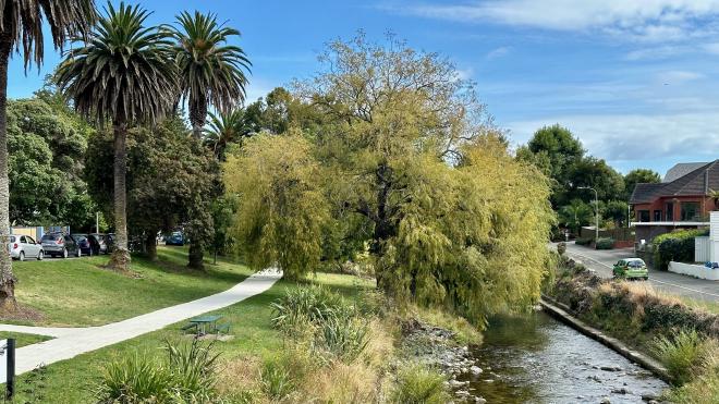The next morning we decided to take a walk to “the centre of New Zealand”, one of Nelson’s claims to fame. Most of our route to the base of the hill was along this very pretty river-side pathway.