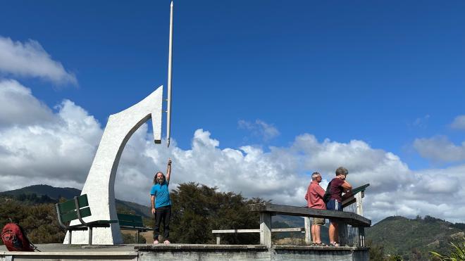 Here’s Greg, standing on the “centre”. We’re using quotation marks because this isn’t actually the geographical centre of the country, which is about 53 kilometres to the south. However, it is the official reference point for all surveys of New Zealand, and has been since 1877. Prior to GPS technology, a defined reference was essential to ensure that all surveys were correct and mutually consistent. The needle monument was installed in 1968.
