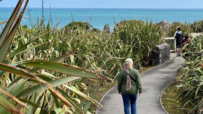 At noon we stopped for half an hour in Paparoa National Park at Punakaiki, home of Pancake Rocks. This gave us enough time for a quick visit to the Rocks and blowholes, which are reached via a well-maintained path through native vegetation, including this harakeke.