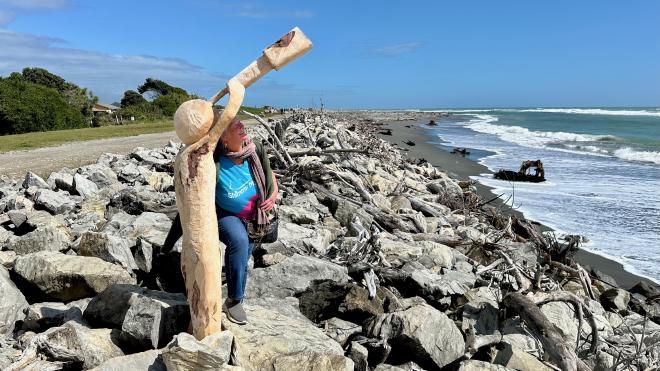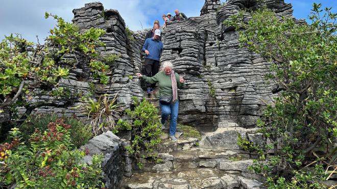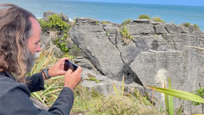 Mid-afternoon we had another stop in the town of Hokitika, where we had time for a bit of a wander along the rocky beach. Karen wasn’t able to figure out what this fellow was so interested in looking at through his telescope.