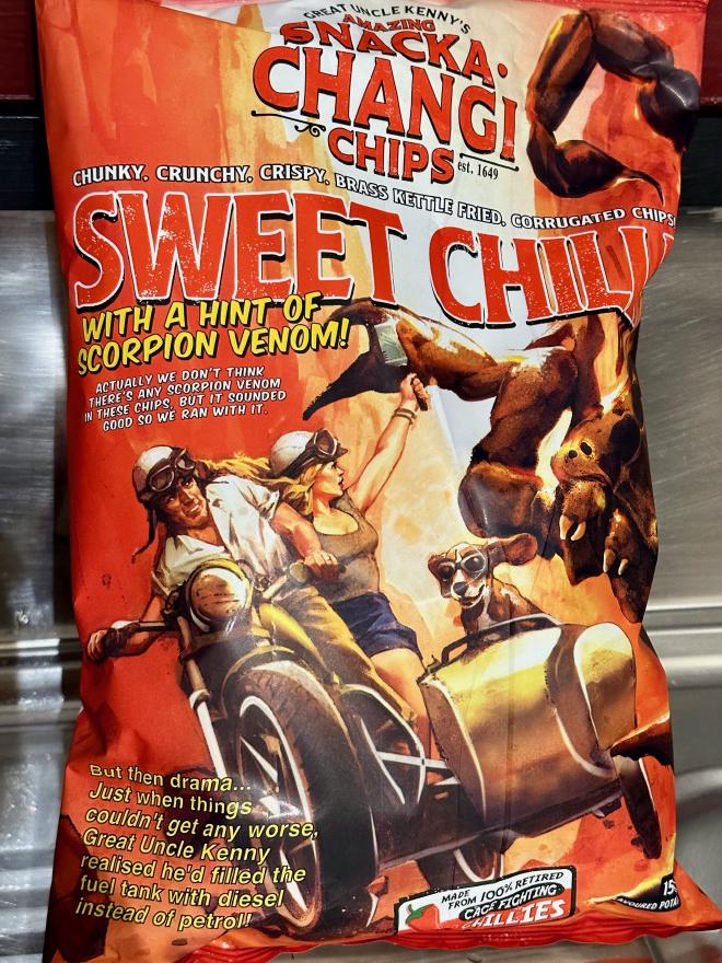 Our grocery shopping yielded this rather over-the-top bag of Great Uncle Kenny’s Amazing Snacka•Changi Chips, which we bought mainly for the label. Fortunately, the chips inside turned out to be quite tasty.